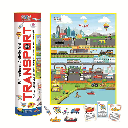 RATNA'S Clever Kids Educational Transport Activity mat (91 cms x 66 cms Jumbo mat) with 12 Both Sides Printed Flash Cards & 22 Transport Vehicle eva Cutouts with Velcro. - Multi Color