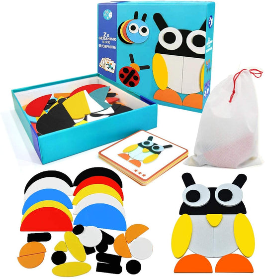 Wooden Animal Puzzle Pattern Blocks with 20 Activity Cards Montessori Educational Learning Toy Game,Geometric Shape Blocks Pattern(Geometric Puzzle)