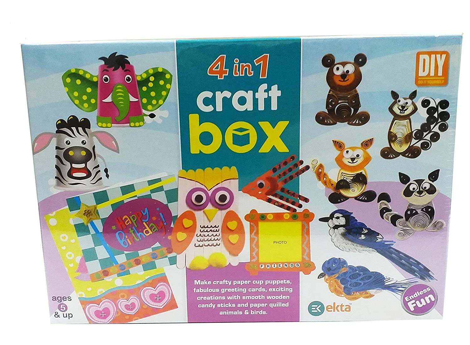 DishanKart 4 in 1 Craft Box Game. Make crafty paper cup puppets, fabulous greeting cards, exciting creations with smooth wooden candy sticks and paper quelled animal & Birds. Be amazed by this giant box of craft from crafty puppets to paper quilled animals, blossoming young imaginations can finally make as many different crafts as they like. This wonderful collection is the ideal way to get your kids into crafting, as well as working with their creative ideas! Spark off your little one ideas and imagination with this cool supply of crafts. An ideal kit for your little artists and crafter develop their creativity and mobility with this high quality collection of amazing essentials. If you are looking for fun, indoor activities to captivate your kids, this is ideal. Key Features:- Interesting time pass game.complete craft kit game for all age group kids and adults. Practice makes a man perfect. Do practice with the things given and with the help of mannual . There are many things to make . You can perform most of them . This is the wonderful funny and awesome entertainment for your little one. It's a Learning game for childrens. Improves children's practical, imagination and planning ability. Teaches them imagintion. Can be gifted to your near and dear on X mas and Birthday gift."