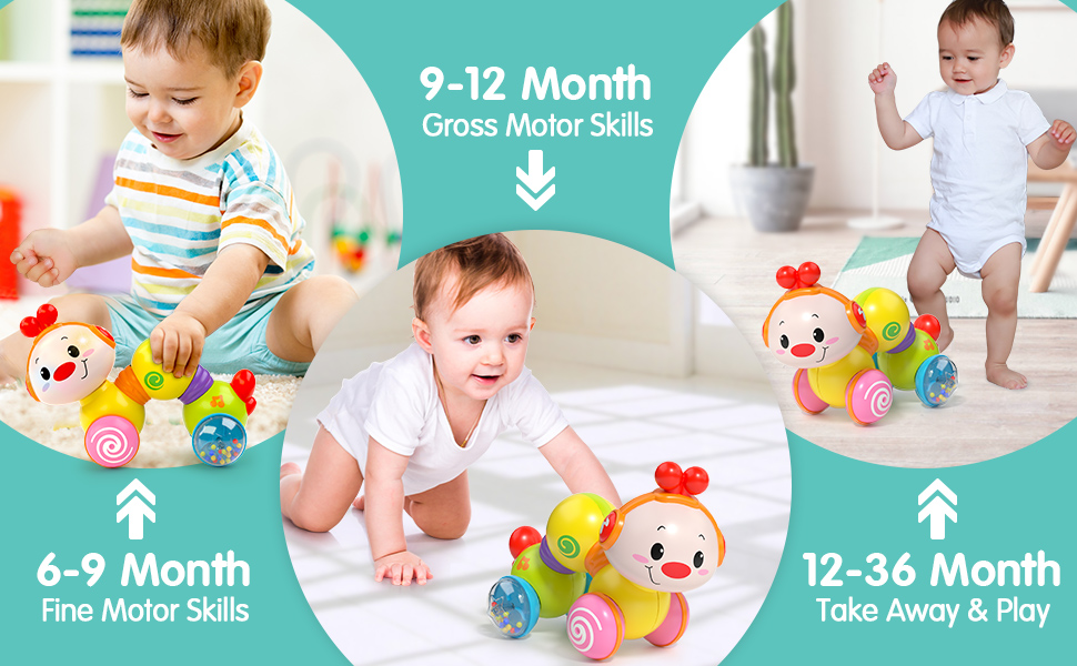 - 【Press & Go with Music & Light, Improve Hand-Eye Coordination】Just press the toy body and release it, it will move. The infant toys use mechanical power and no need to use the battery to move, to play in a green way. The caterpillar's left ear is designed as a music & light button. Your little one will improve hand-eye coordination and learn cause & effect when playing. Good choices as 6 month old baby toys 9 month old baby toys 12-18 months, baby girl toys for 1 year old girl gifts toys.