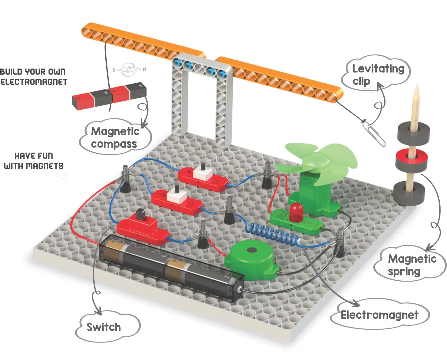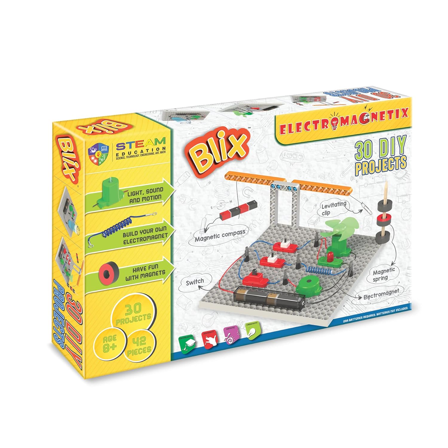 Blix Electromagnetix, the newest coolest science kit for young scientists. With Blix Electromagnetix Learn about electricity and magnetism using Magnet, LED, Motor, Wires, Buzzer, etc. Build circuits, experiment with real electronic components, play soccer with magnets, build an air powered boat, make your own compass and do a lot more! 30 experiments in 1 set