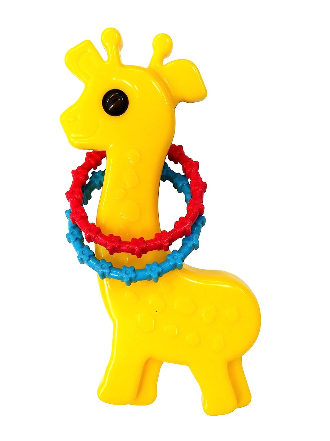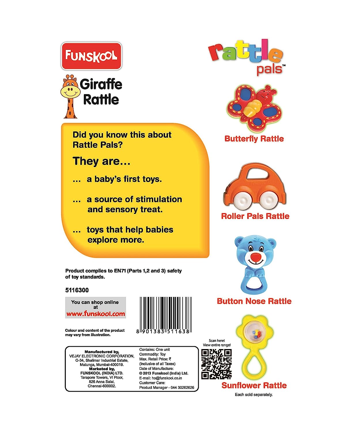 Watch your baby observe and play with this simple yet amazing Funskool baby giraffe rattle. This coloured rattle toy aims at stimulating the three main senses of your 6 month old baby, which include sight, sound and touch. This baby giraffe rattle comes in attractive colours for visual development. Even the rings around the neck of the baby giraffe that make sound while shaking are of different colours. It is specially designed to attract your baby not just through sight, but also through sound and touch.