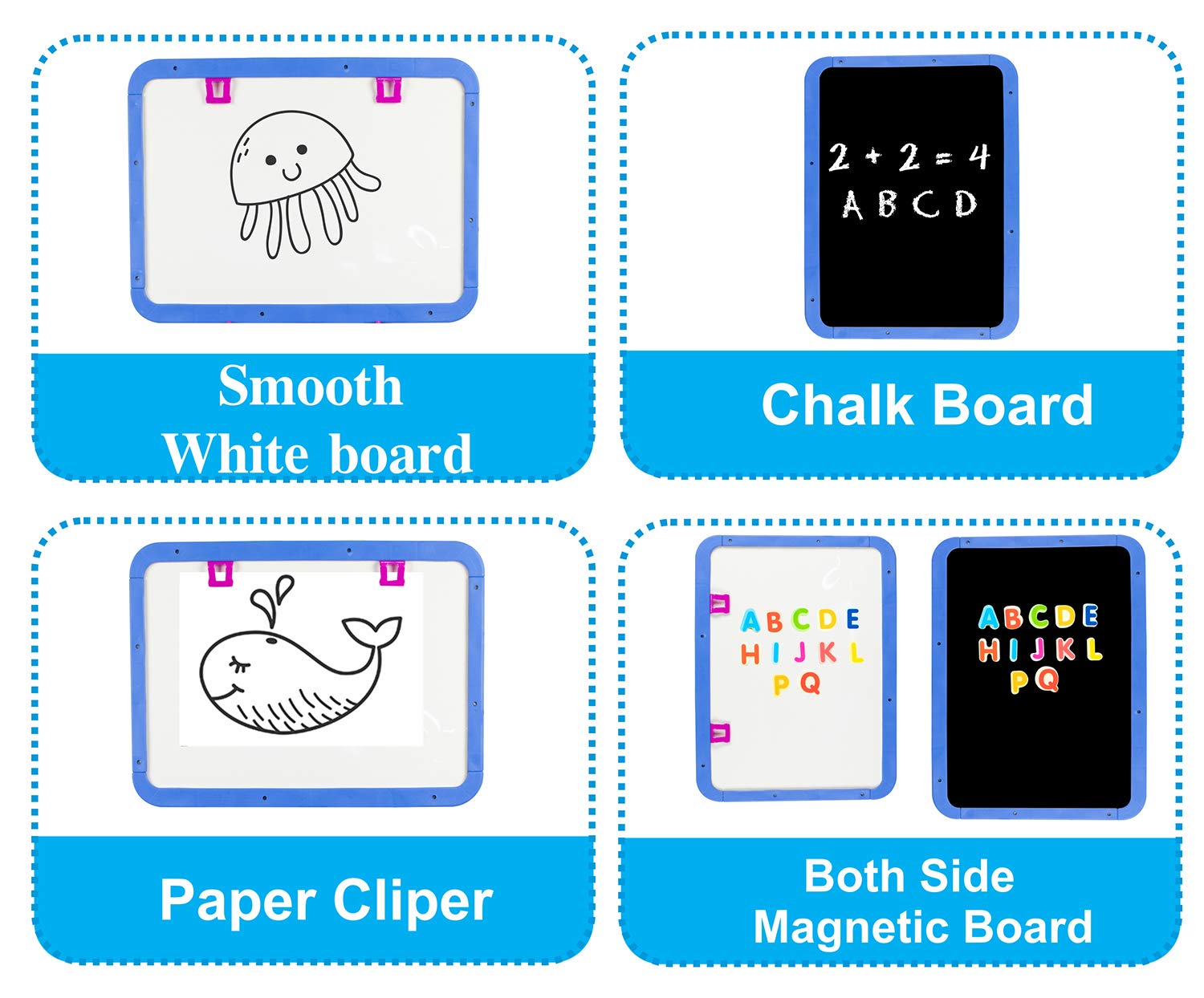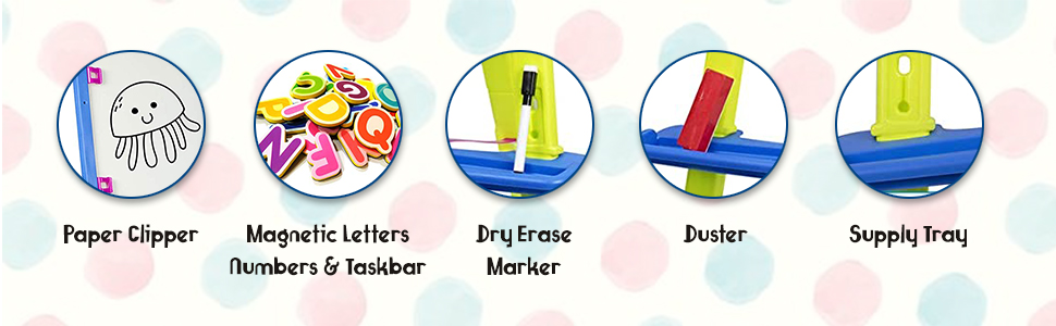 - It contains 2N Height adjustment clips, 1N Magnetic Board 2N card holder, 1N stand strip, 2N Alphabet & Task bar,1N Character Card, 1N Marker, 1N Duster, 2N Chalk, 8N Parts to Assemble Stand.