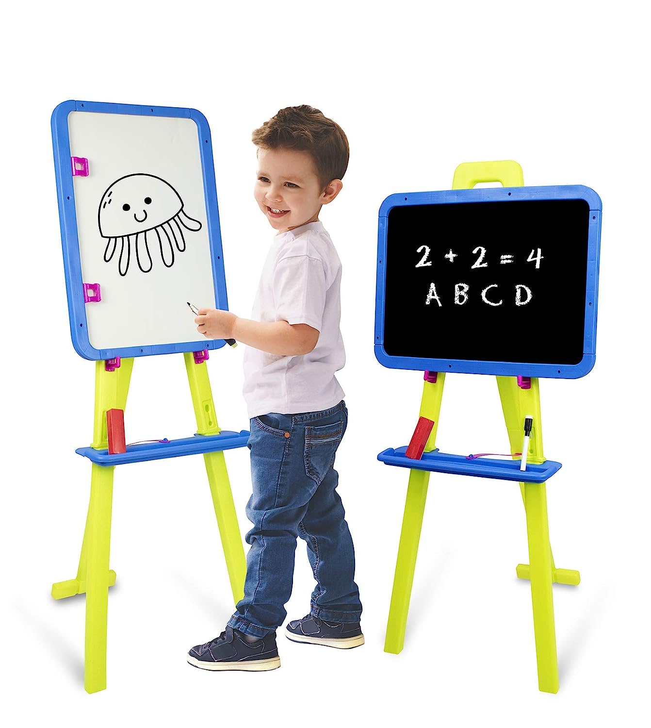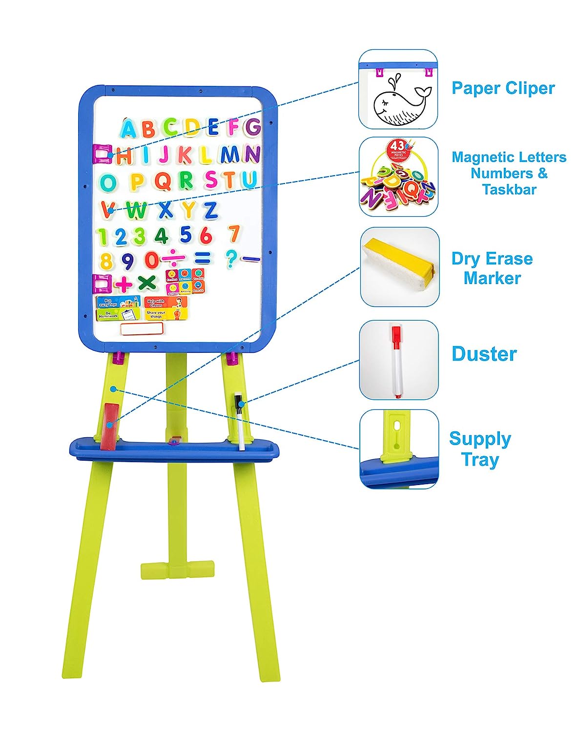 - HEIGHT ADJUSTABLE LOCK: The double-sided will give you maximum writing space. It allows you to have two works going and being able to focus on one list at a time. Its height-adjustable & foldable quality allows you to carry this by themselves from room to room. The height of easel can be adjusted according to different ages of kids