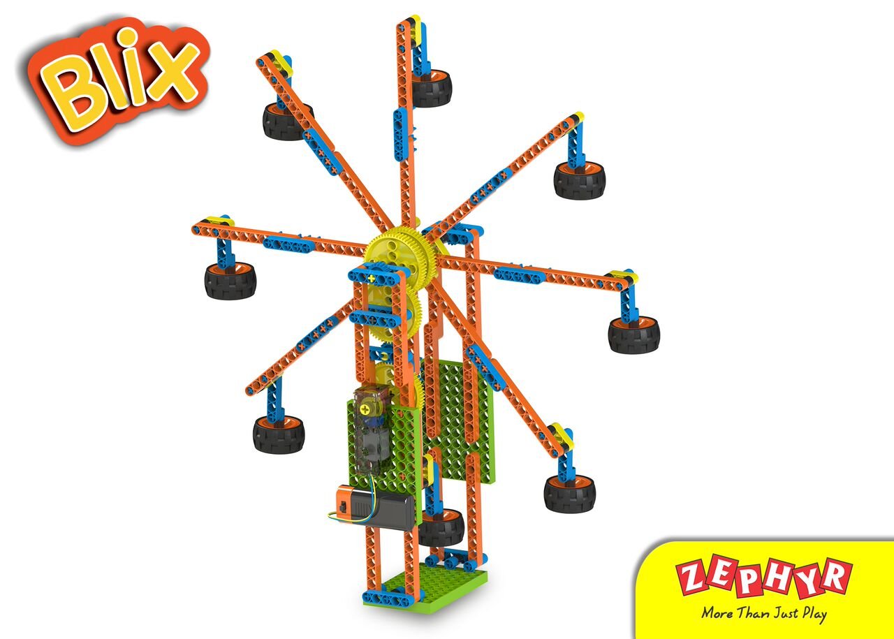 BLIX AMUSEMENT PARK, In this age of speed and technology it is extremely important to give your child the fighting edge. To help them develop this aptitude for technology give them a fun filled, exciting, thought provoking and developmental tool or toy as you'd like to call it. Give your child a BLIX - Amusement Park. In this set your child will build various contraptions that they would see in an amusement park, including giant wheels, tora-tora, and cups and saucers. This varied model base with multiple functions will enable them to learn mechanical principles and concepts. For example: the Tora Tora, has 2 speeds, as we'd like to say a different ride, a faster ride for adults and a slower speed ride for children. This is done via changing certain gears and combinations. Similarly the Cup and saucer once made has multiple motions and all of them dependent on each other. Thus enhancing again the child's understanding of mechanisms and mechanical motion. All this done in a very simple way that even a child of 8 will be able to build and understand everything we aspire to with this set.