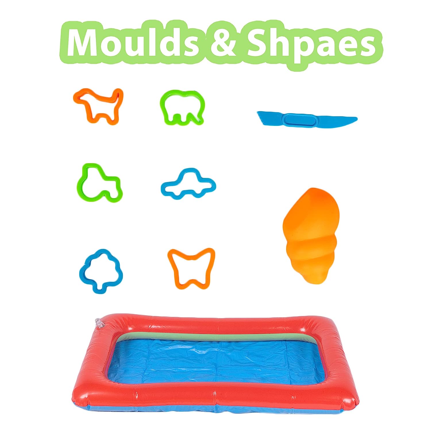 - Contents: 500 g sand, 1 Inflatable tray, 1 Big Mould, 6 Small moulds & 1 toy plastic knife.