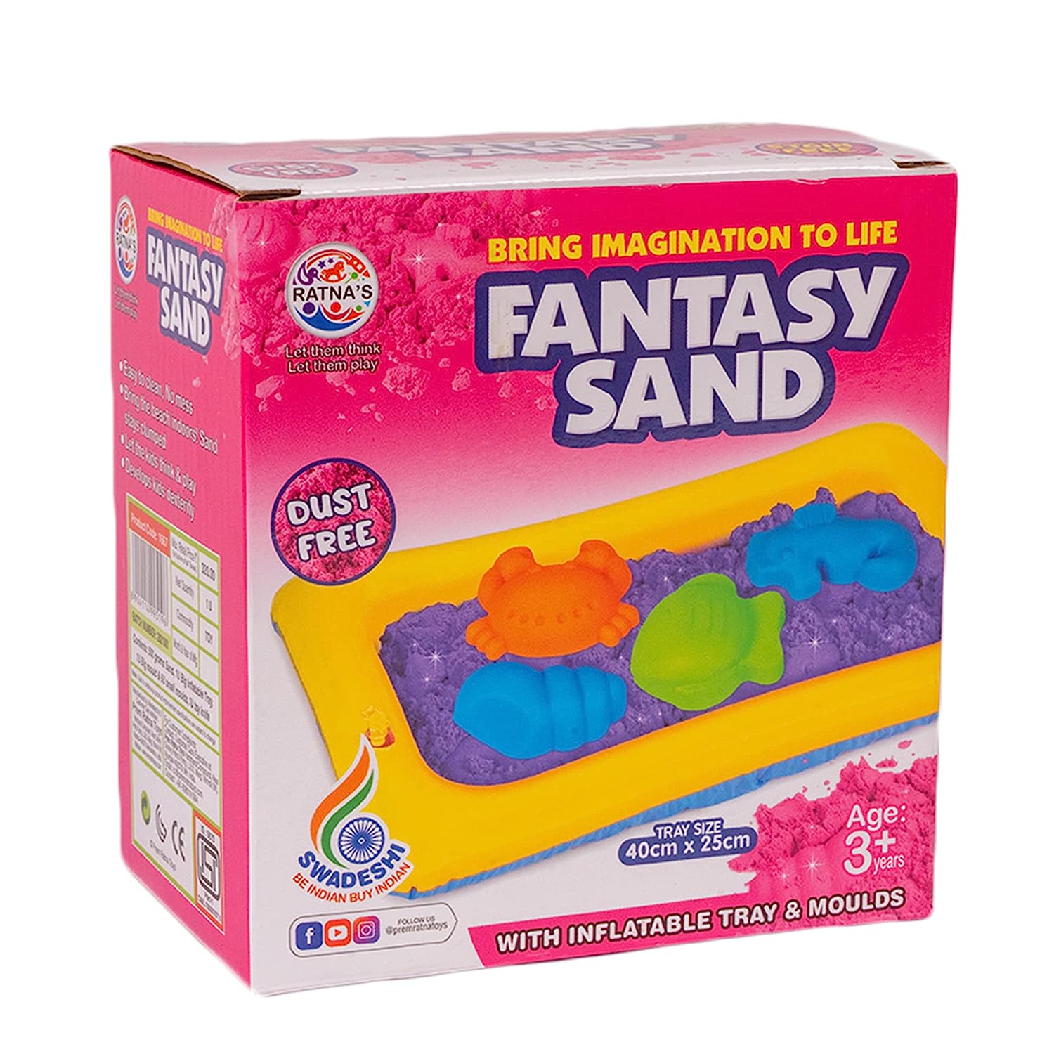 Ratna's Fantasy Sand Wonder 500 Grams with Inflatable Tray, 1 Big Mould, 6 Small Moulds & 1 Toy Plastic Knife, Smooth, Non Sticky Kinetic Active Sand Set for Kids to Play. (Pink)