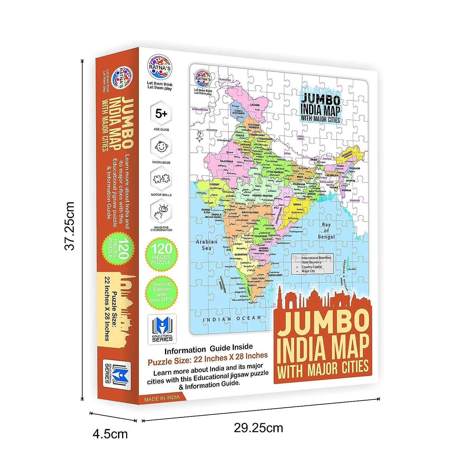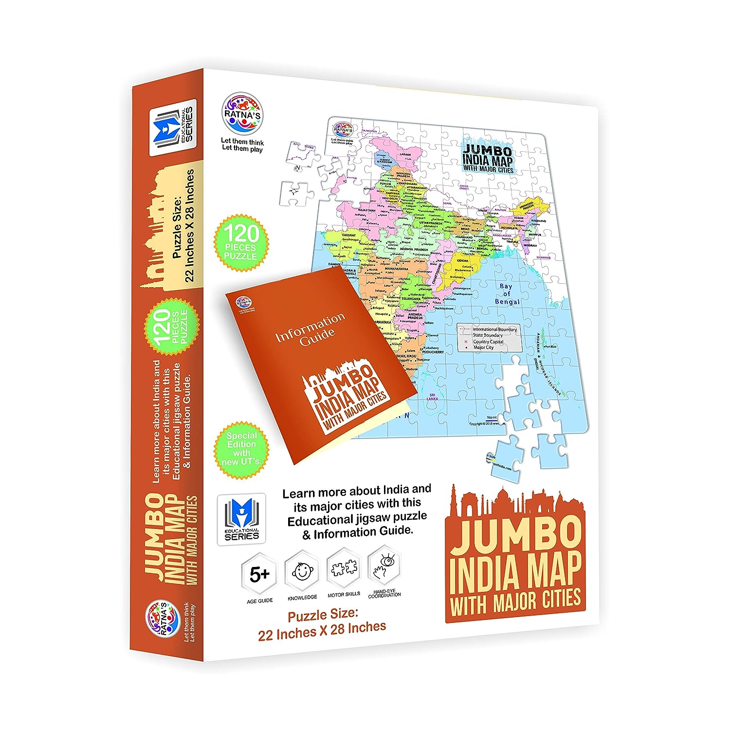 Premium quality jumbo India map for kids 120 pieces jigsaw puzzle with a 12 page information guide inside Ratna's premium quality jumbo India map 120pieces jigsaw.With a 12 page information guide about India.