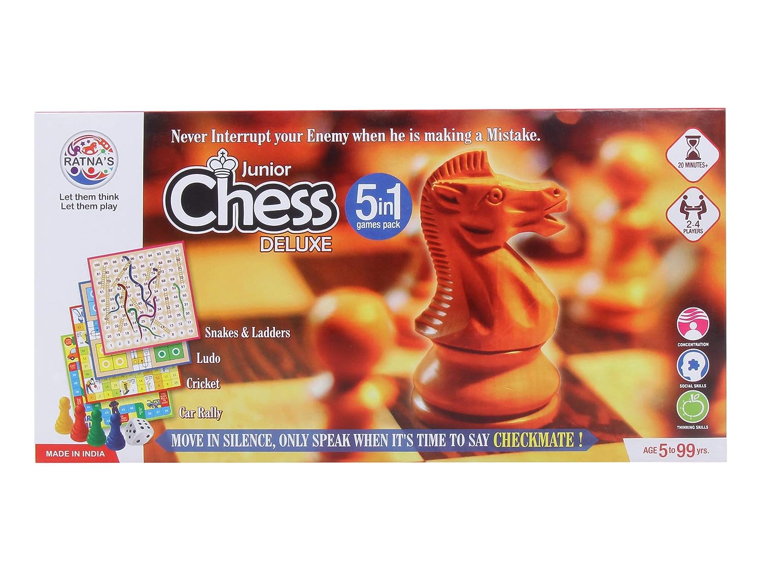 Premium quality board games for family. This is a 5 in 1 chess board game|water proof board makes it long lasting games in 1 chess, Ludo, snakes & ladders, car rally, cricket Ratna's premium quality 5 in 1 chess junior deluxe board game|board size: 11 inches * 11 inches|chess, Ludo, snakes & ladders, cricket, car rally.