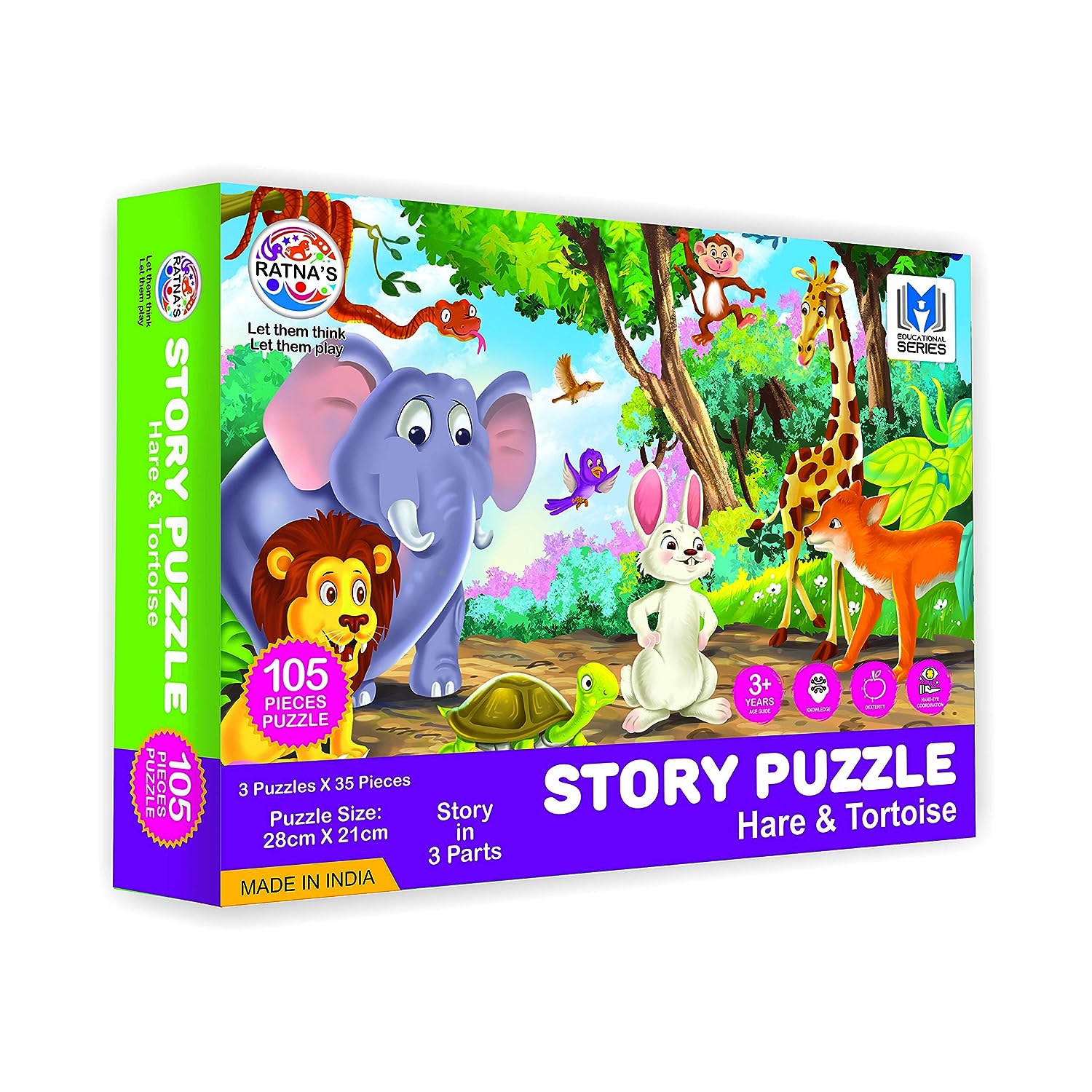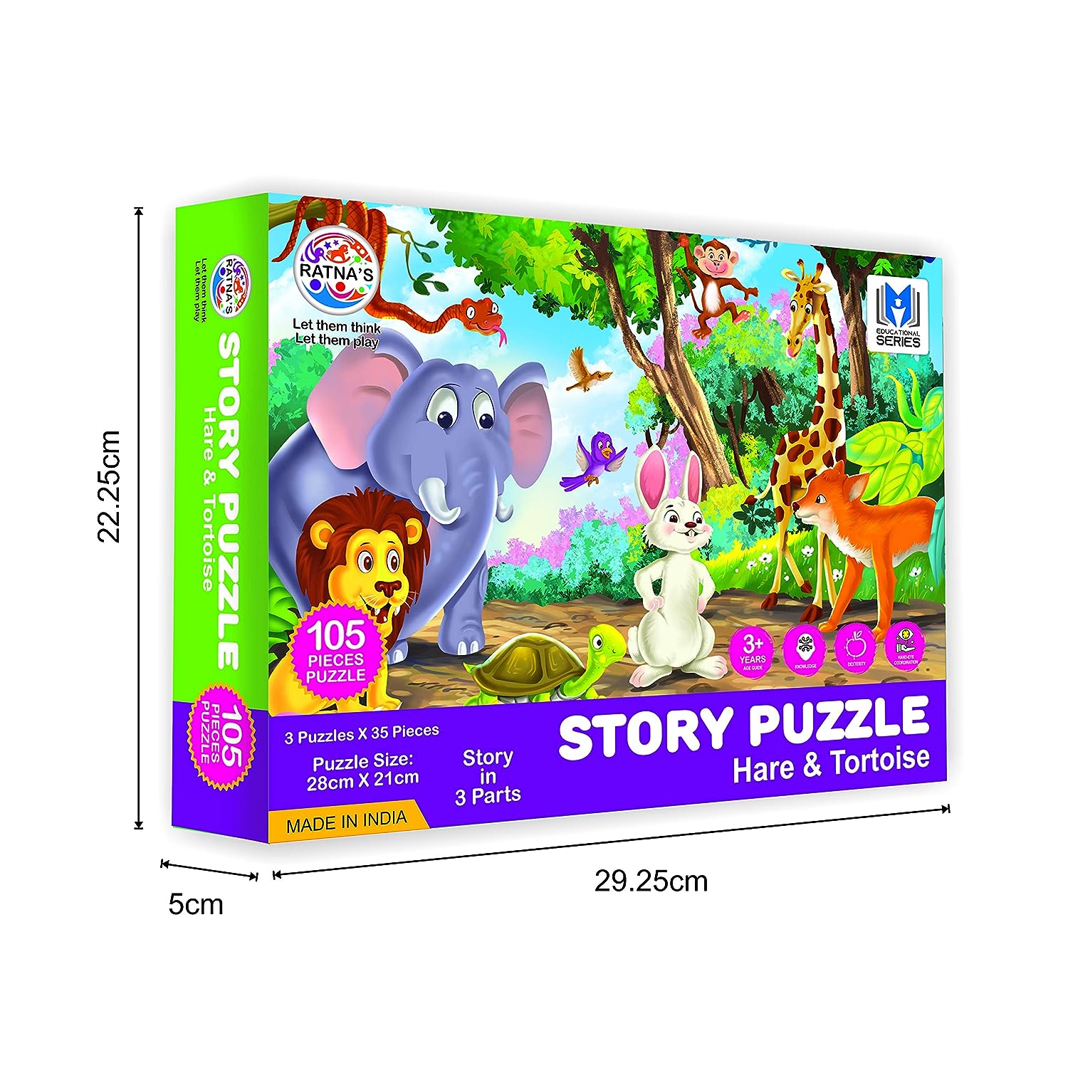 RATNA'S story jigsaw puzzle hare and tortoise for kids. The story is divided into 3 parts. This jigsaw puzzle contains 3*35 pieces jigsaw puzzle.