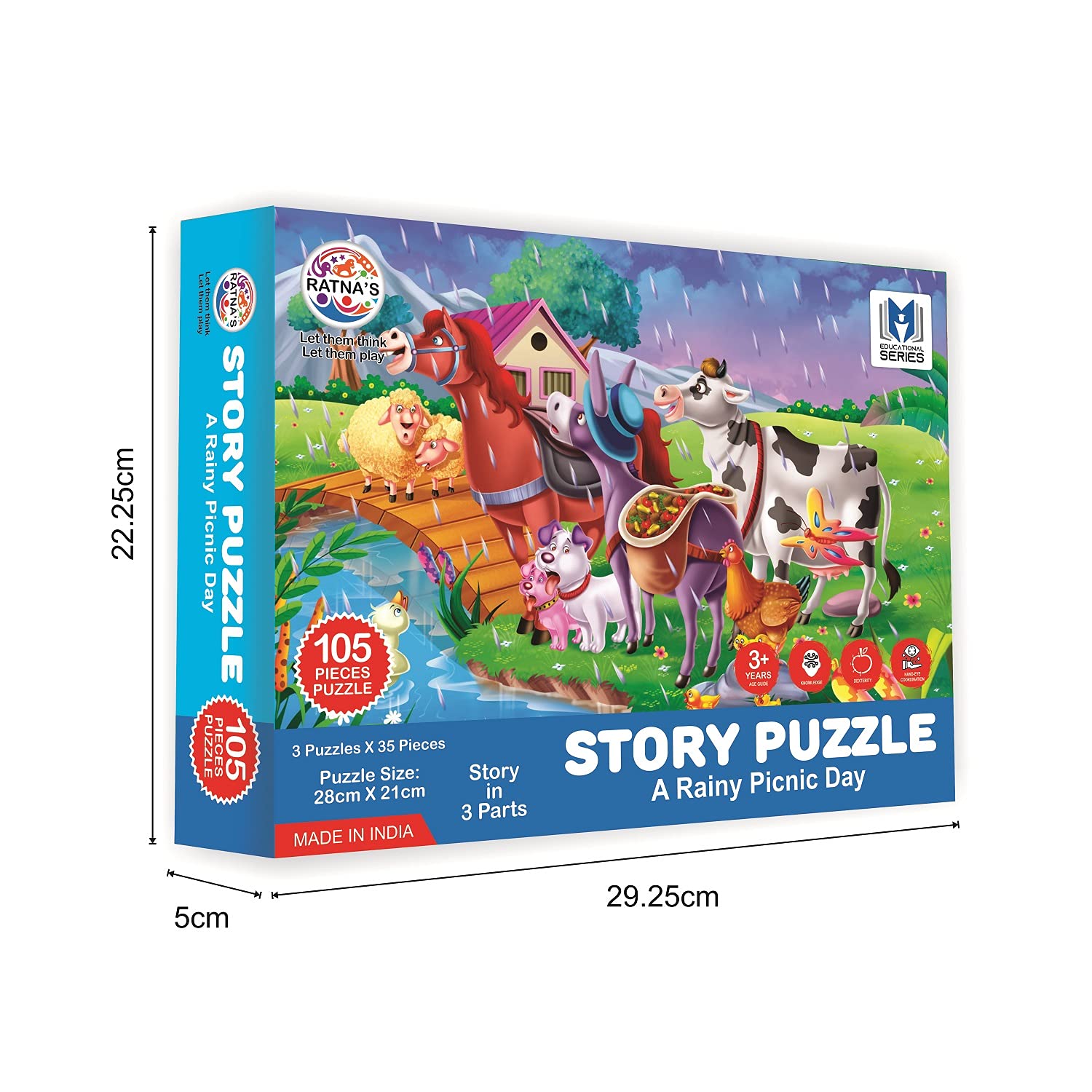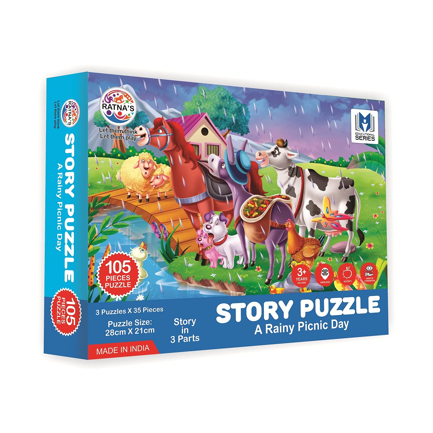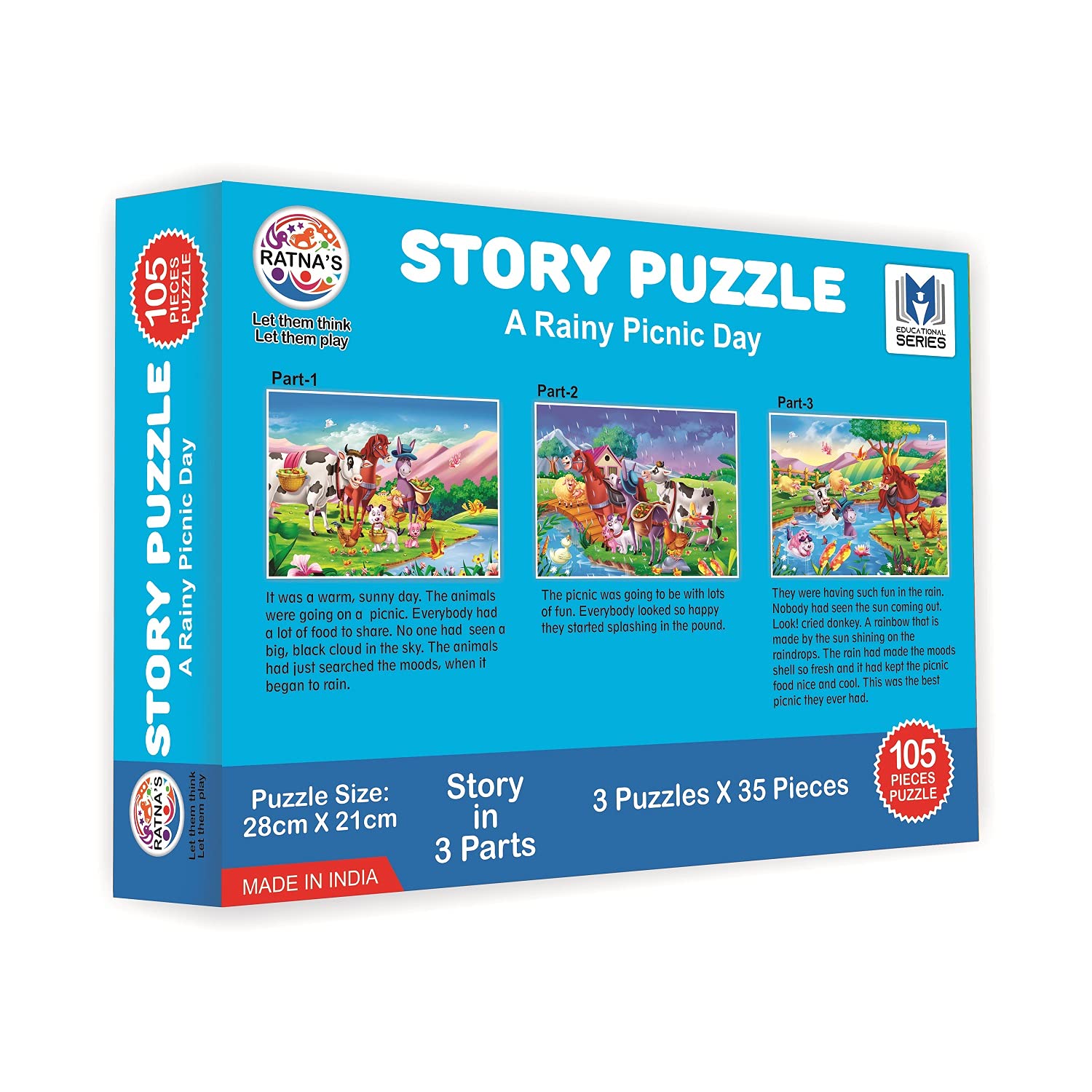 Ratna's story jigsaw puzzle for kids This pack includes 3 jigsaw puzzle of 35 pieces each with a story book inside Ratna's story jigsaw puzzle rainy picnic day for kids. 3 jigsaw puzzle included in the pack with a story book
