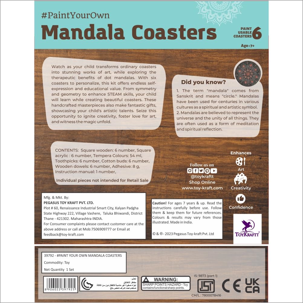 - This painting kit for kids enables you to make 6 Mandala design table coasters useful as home décor items from start to finish by simple, at the same time novel painting technique and craftwork. You are bound to enjoy this creative journey of dot painting and extend it to explore the art form of Mandalas.