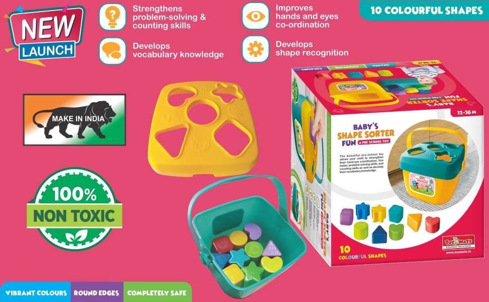 Educational Objective(s) Shape Recognition, Sorting Skills Assembly Required No Colour Multicolor Item part number TM52- 62 Manufacturer recommended age 12 months and up Manufacturer Toymate Country of Origin India -
