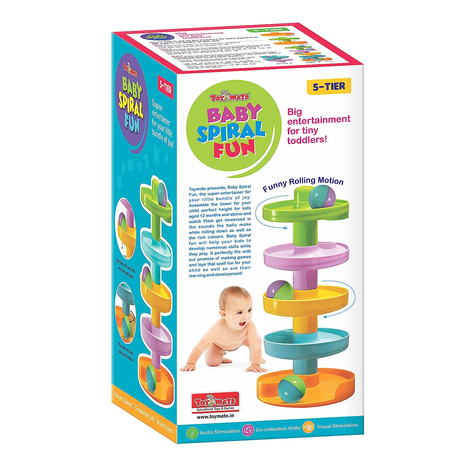 Big Entertainment for Tiny Toddlers! We know that your little one is the apple of your eye and you want them to play and learn with the best products. Toymate is here with Baby Spiral Fun for all that and more! This simple and enjoyable toy will not only engross your kids in unlimited fun, but also develop their overall personality. Just assemble the 5-tier ball ramp for your kids and encourage them to roll it from the top. It will help them grow basic skills like grasping, reaching, hand-eye coordination, sitting, standing, etc. Just rolling a ball is equal to tons of fun and learning! Contents: 5 Tiers & 3 Balls Assorted Colour