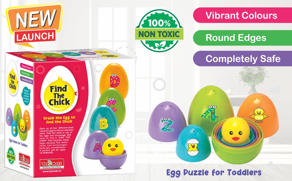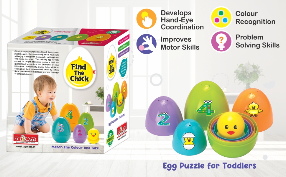 Educational Objective(s) Sorting Skills Assembly Required No Material Type(s) Plastic Colour Find The Chick in Egg Nesting Toy Item part number TM52- 69 Manufacturer recommended age 12 months and up Manufacturer Toymate Country of Origin India -